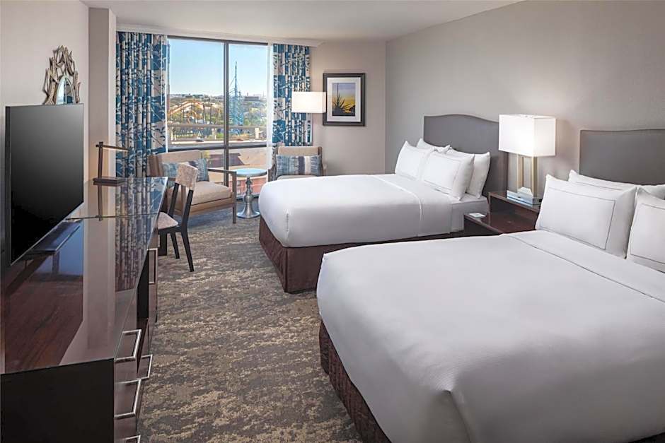 This mobility and hearing accessible standard room features two double beds, and an accessible tub. The room also has a visual alarm, and notification devices for the doorbell or door knock and incoming telephone calls. Each guest room offers a 42-inch flat-screen HDTV with 60 HD channels and 45 HD music channels, mini-refrigerator, laptop safe, work desk, two-line phones with voicemail, coffeemaker, iron, ironing board, and hair dryer. Featuring luxurious bath amenities. Any corresponding photo may not reflect the specific accessible room type or room feature.